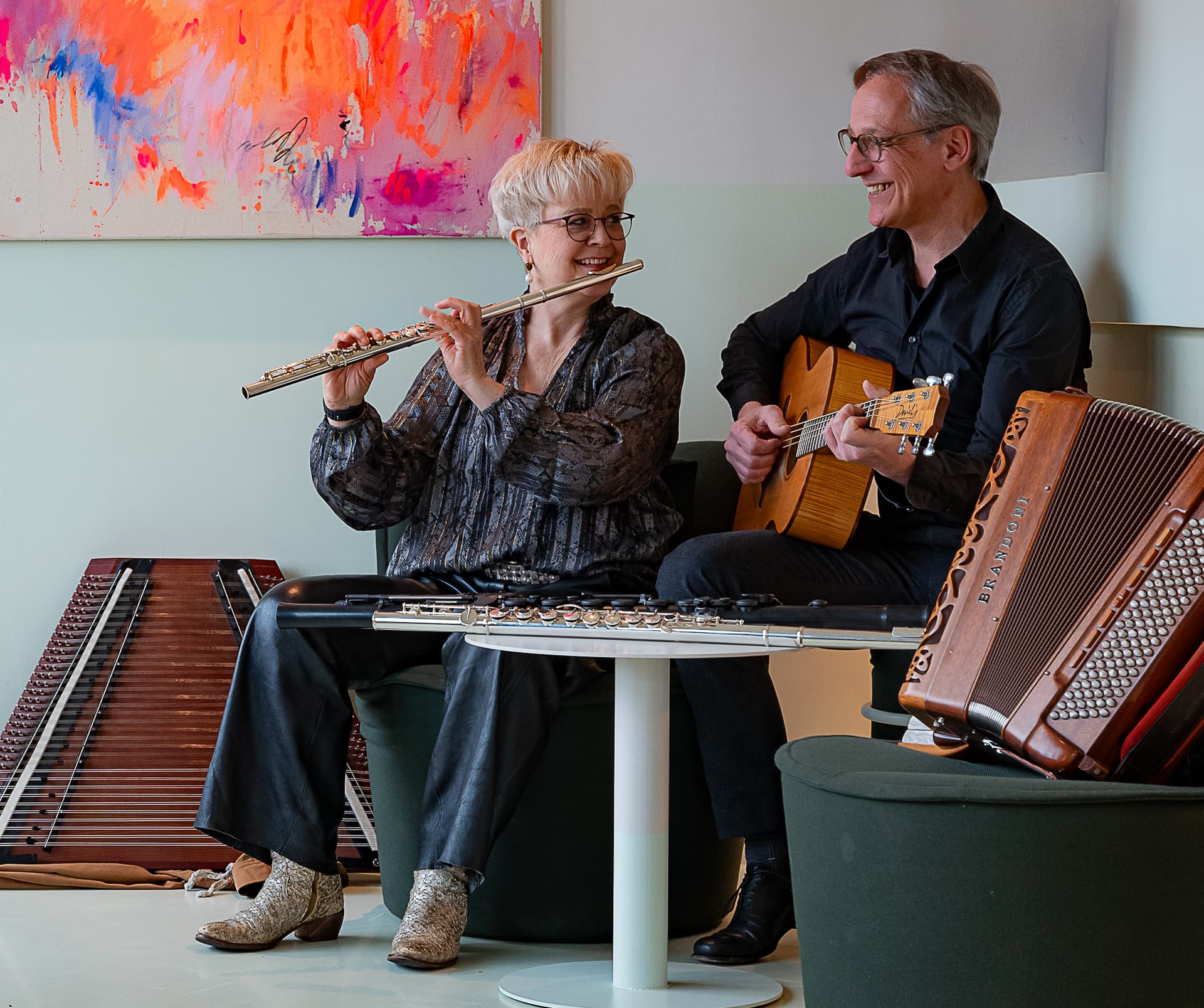 Mit den Instrumenten Gitarre, Akkordeon, Flöten und Hackbrett zaubert das Duo ein musikalisches Kaleidoskop, bei dem sich Latin, Jazz, Klezmer und Eigenkompositionen um die bunte Vielfalt der Klänge drehen. Faszinierende und ungewöhnliche Klangkombinationen werden in immer neuen Varianten angeordnet, die die Sinne verzaubern. Die beiden Musiker des Duo Kaleido sind Klangabenteurer, die die Grenzen zwischen den Genres spielerisch sprengen und neue musikalische Klangwelten schaffen.