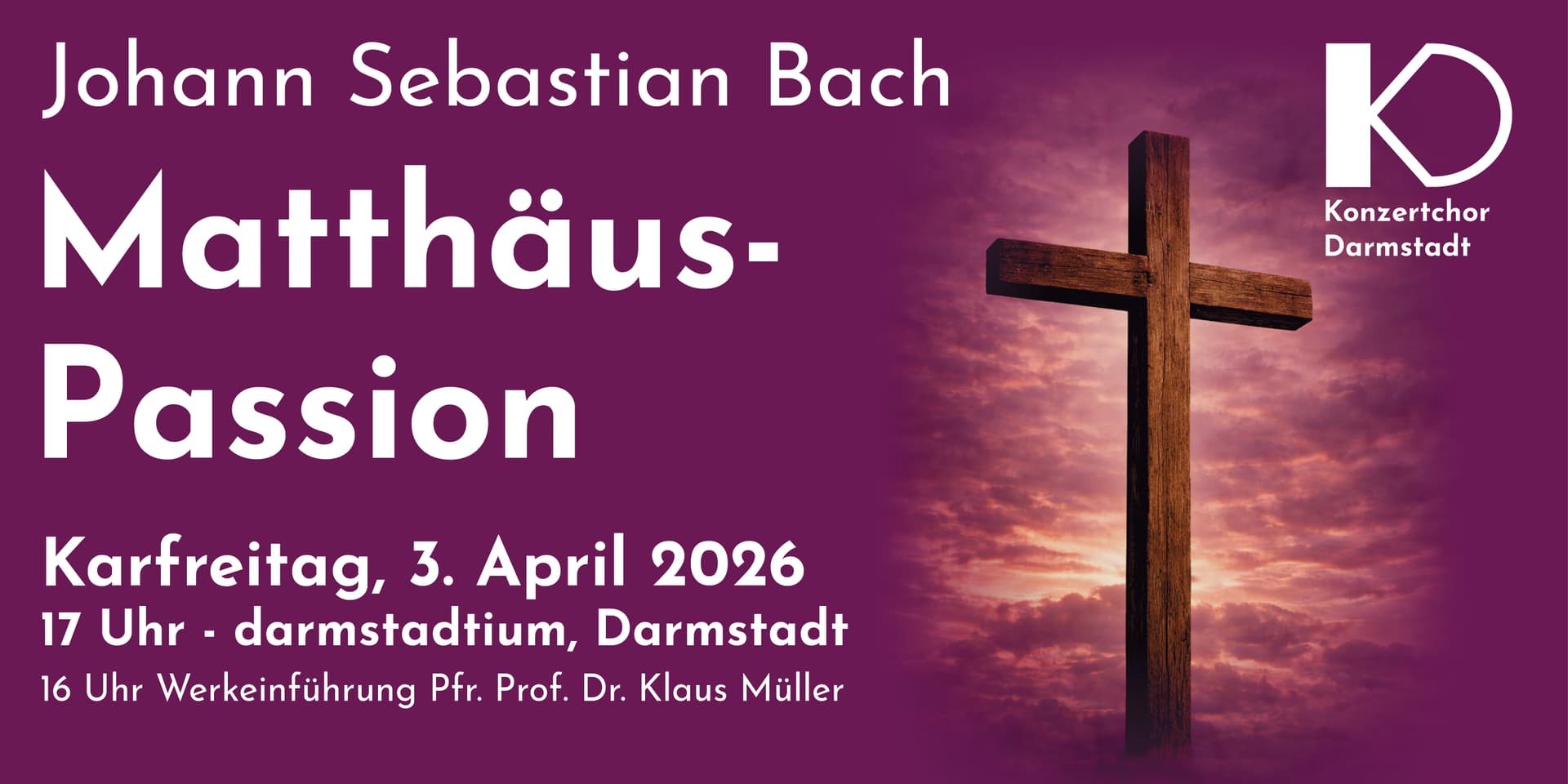 Der Konzertchor führt am Karfreitag, dem 03.04.2026, um 17 Uhr im darmstadtium Johann Sebastian Bachs Matthäus-Passion, BWV 244, auf.