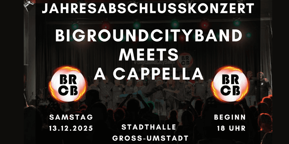 Die BigRoundCityBand lädt ein zum großen Jahresabschlusskonzert in Groß-Umstadt. Mit einem abwechslungsreichen Programm, viel Spielfreude und der Moderation von Bürgermeister René Kirch verabschiedet sich die Band musikalisch aus dem Jahr 2025. Über 25 Musikerinnen und Musiker stehen gemeinsam auf der Bühne – mit großem Bläsersatz und sattem Sound.