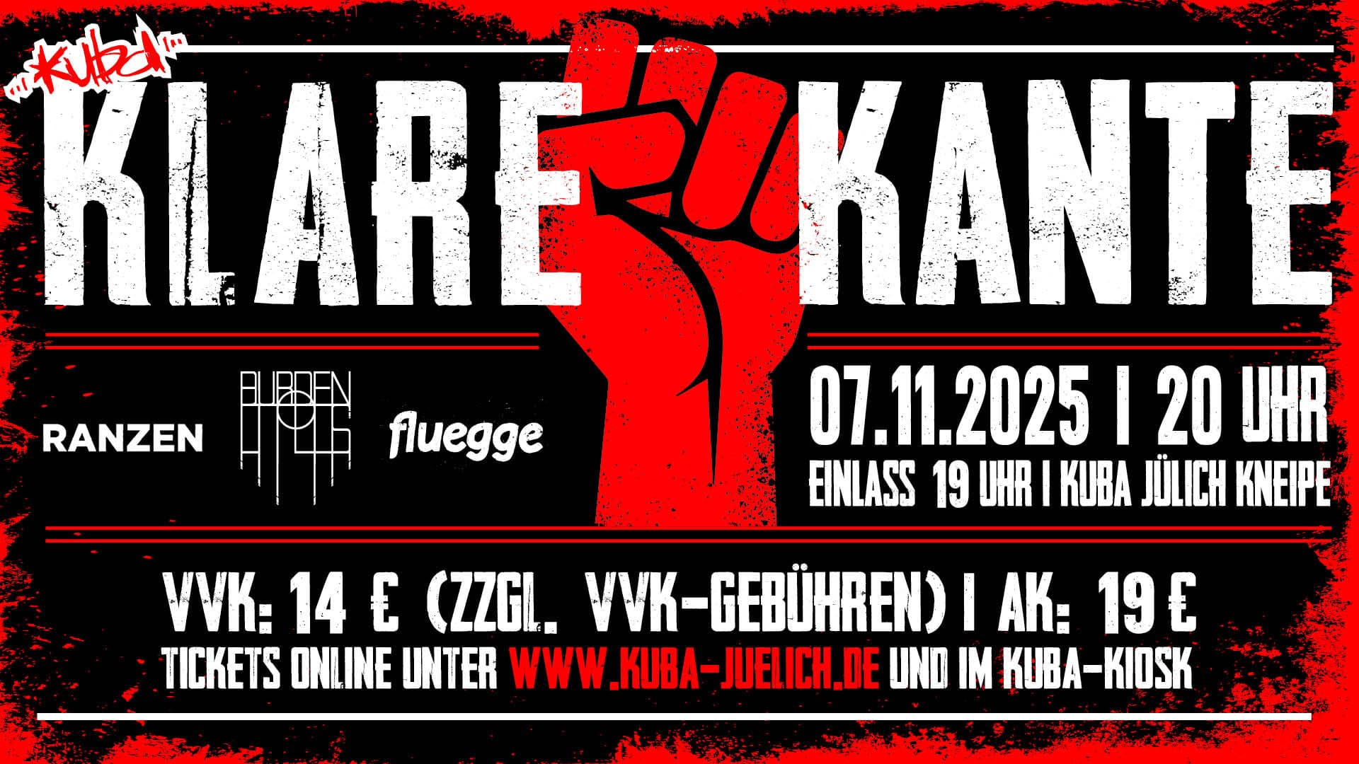 Am Freitag, 7. November 2025 heißt es wieder ab 20 Uhr „Klare Kante!“ im Jülicher Kulturbahnhof, wenn die 3 Bands Ranzen, Burden to Atlas und Fluegge die Bühne in der KuBa Kneipe rocken.
