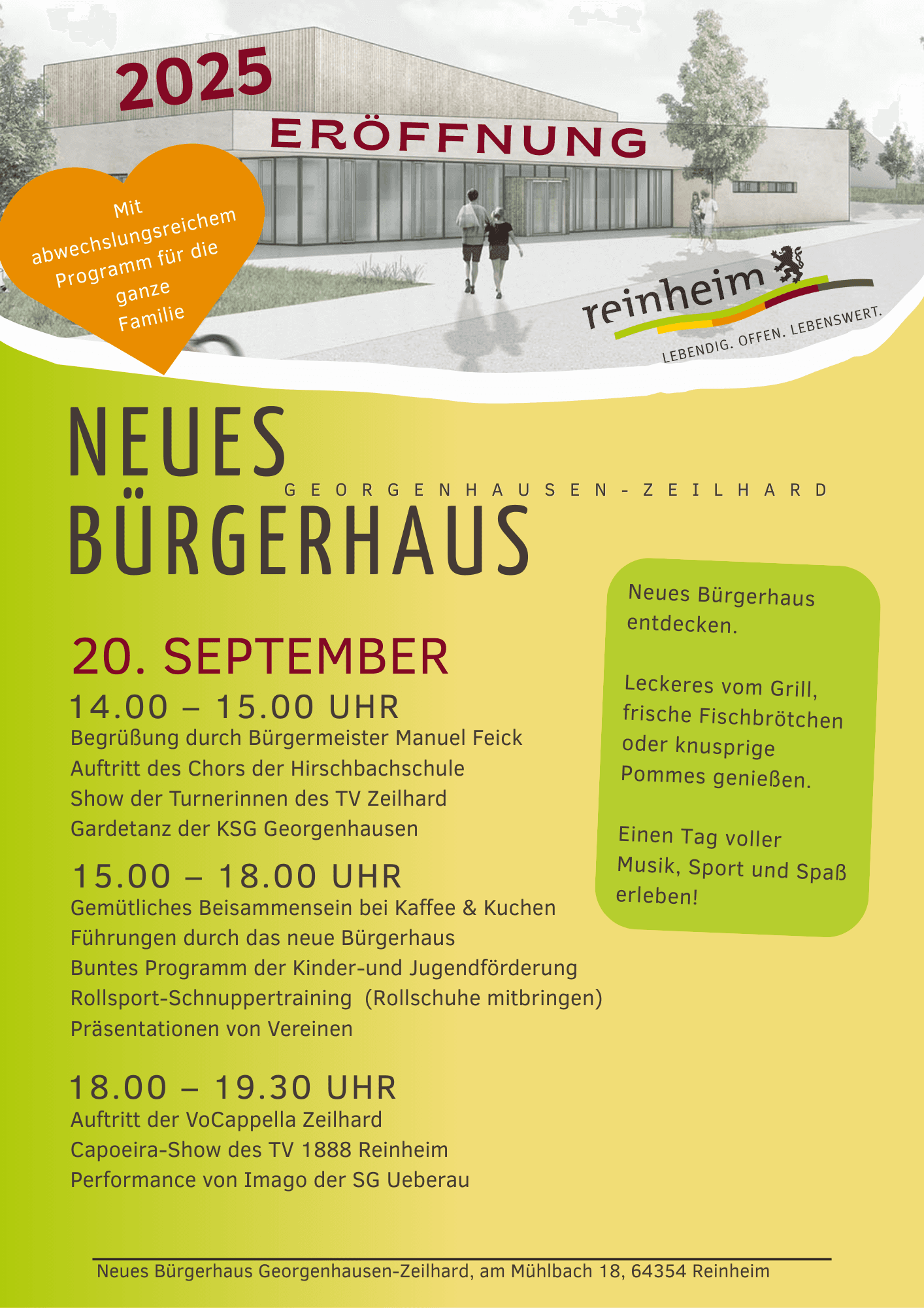 Nach intensiver Planungs- und Bauphase wird das neue Bürgerhaus offiziell seiner Bestimmung übergeben. Mit seiner Adresse „Am Mühlbach 18“ liegt es geografisch zwischen den Reinheimer Stadtteilen Georgenhausen und Zeilhard.