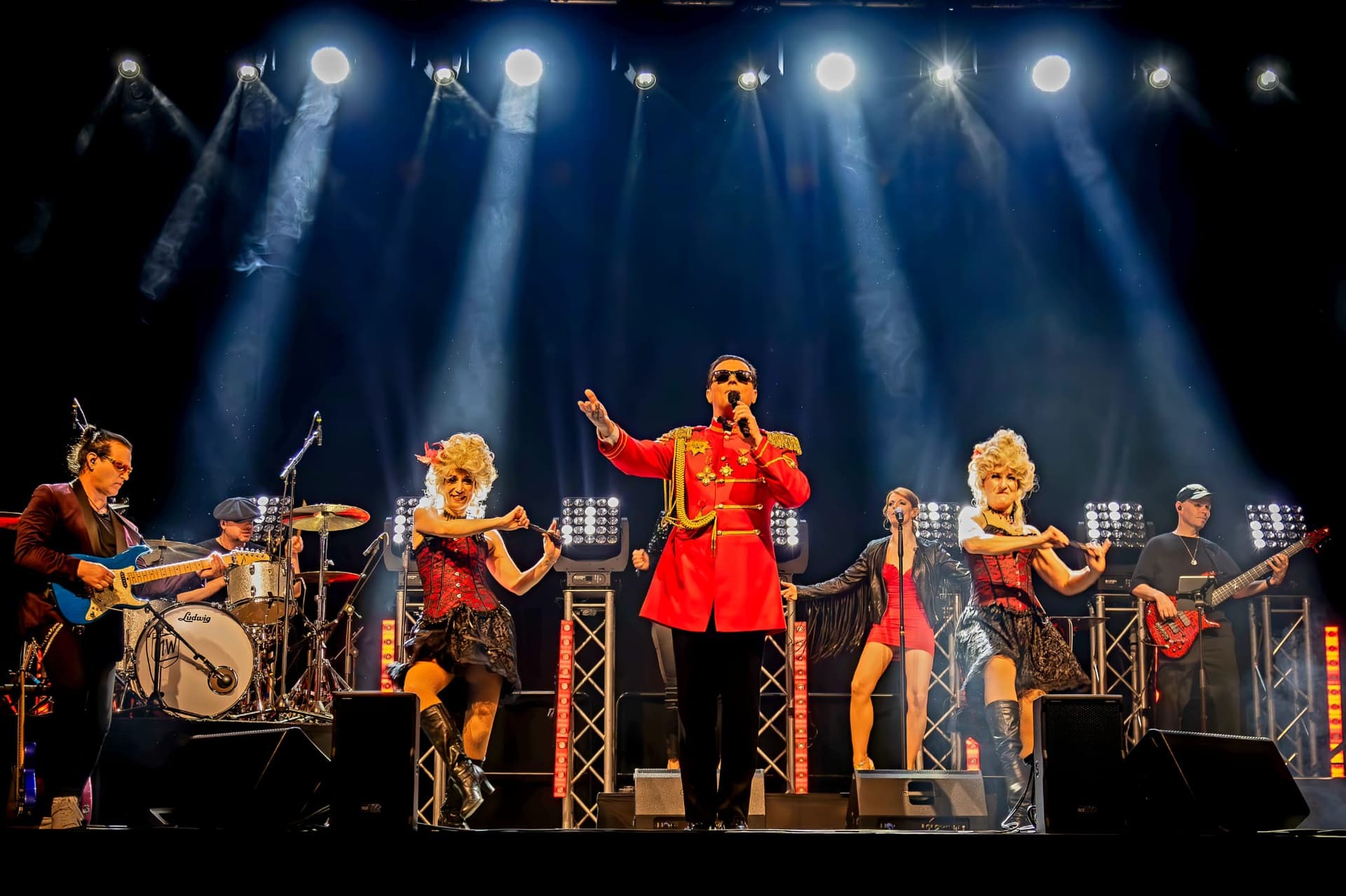 Begleitet von Live-Band, Sängerinnen und Tänzerinnen wird das