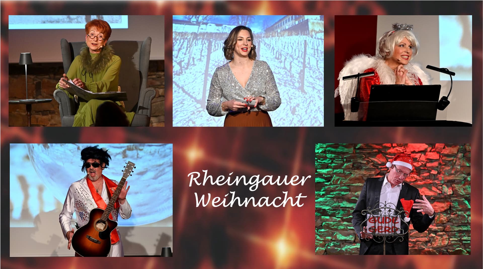 Katharina Höfling (geb. Fladung) führt als charmante Rheingauer Moderatorin durch den weihnachtlichen Abend, bei dem im Finale auf der Bühne Weihnachtslieder gesungen werden. Die vielseitige Rheingauer Künstlerin Dunja Koppenhöfer setzt musikalische Glanzlichter, der Rheingauer Comedian Gerd Brömser sorgt mit seinen Fest Vorbereitungen für heitere Momente bei der Rheingauer Weihnacht. Frank Zimmermann begeistert mit einfühlsamen Liedern und Monika Albert vom Rheingauer Mundartverein erzählt Rheingauer Weihnachtsgeschichten in Mundart. Um die perfekte Technik kümmert sich Stephan Weber von STUDIO22.