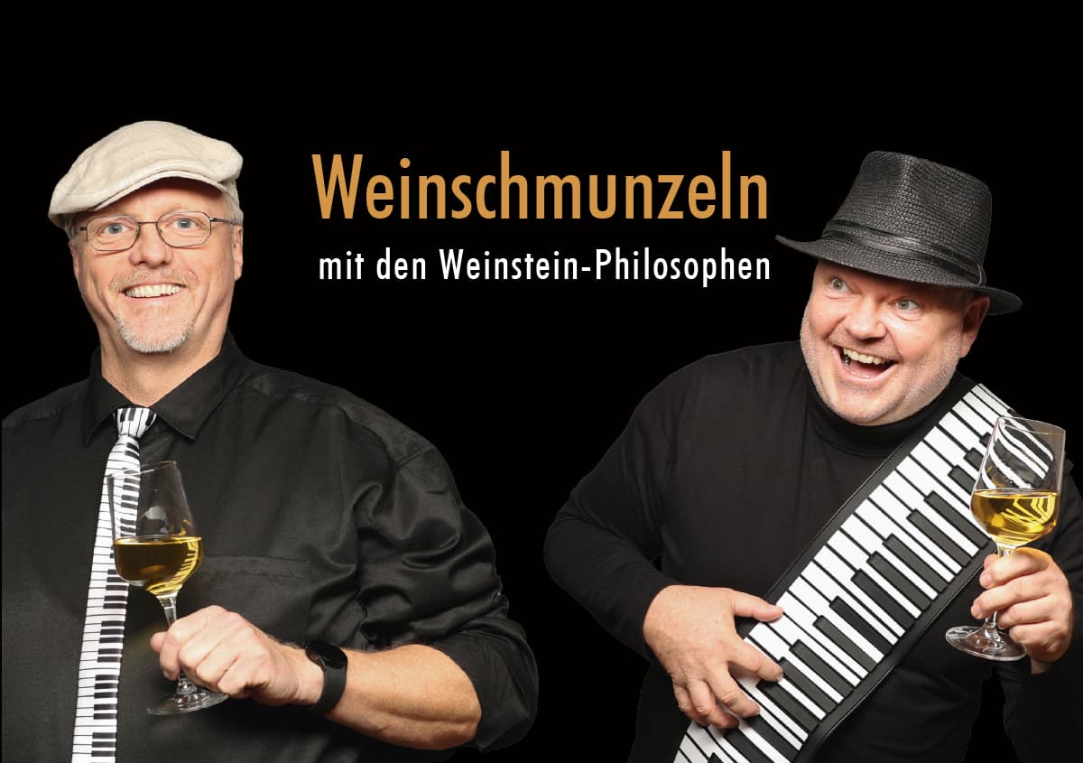 Was benötigen Michael Geyer und Stefan Paschold um als „Weinstein-Philosophen“ einen amüsanten Abend mit Ihren Zuschauern zu verbringen? Ganz einfach: Ein wohl gestimmtes Klavier und einen guten Rheingauer Wein. Sind diese Zutaten vorhanden, wird es musikalisch, lustig und weder Kehle noch Auge des Gasts bleiben trocken. Michael, als studierter Sänger und Pianist ein Meister der Tasten hat in Stefan seinen kongenialen Partner gefunden, der mit einer Mischung aus humorvollen und melancholischen Texten das Publikum zum Lachen und Nachdenken bringt. Gemeinsam präsentieren sie mit „Weinschmunzeln Vol. 1“ ein abendfüllendes Programm, das mit 100 Prozent handgemachter Musik die Herzen höher schlagen lässt. Von Eigenkompositionen über bekannte „Gassenhauer“, bis hin zu Gedichten und Anekdoten rund um den Wein, den Rhein, den Rheingau und seine Insassen; hier ist für jeden Geschmack etwas dabei! Und Mitsingen ist ausdrücklich erlaubt.