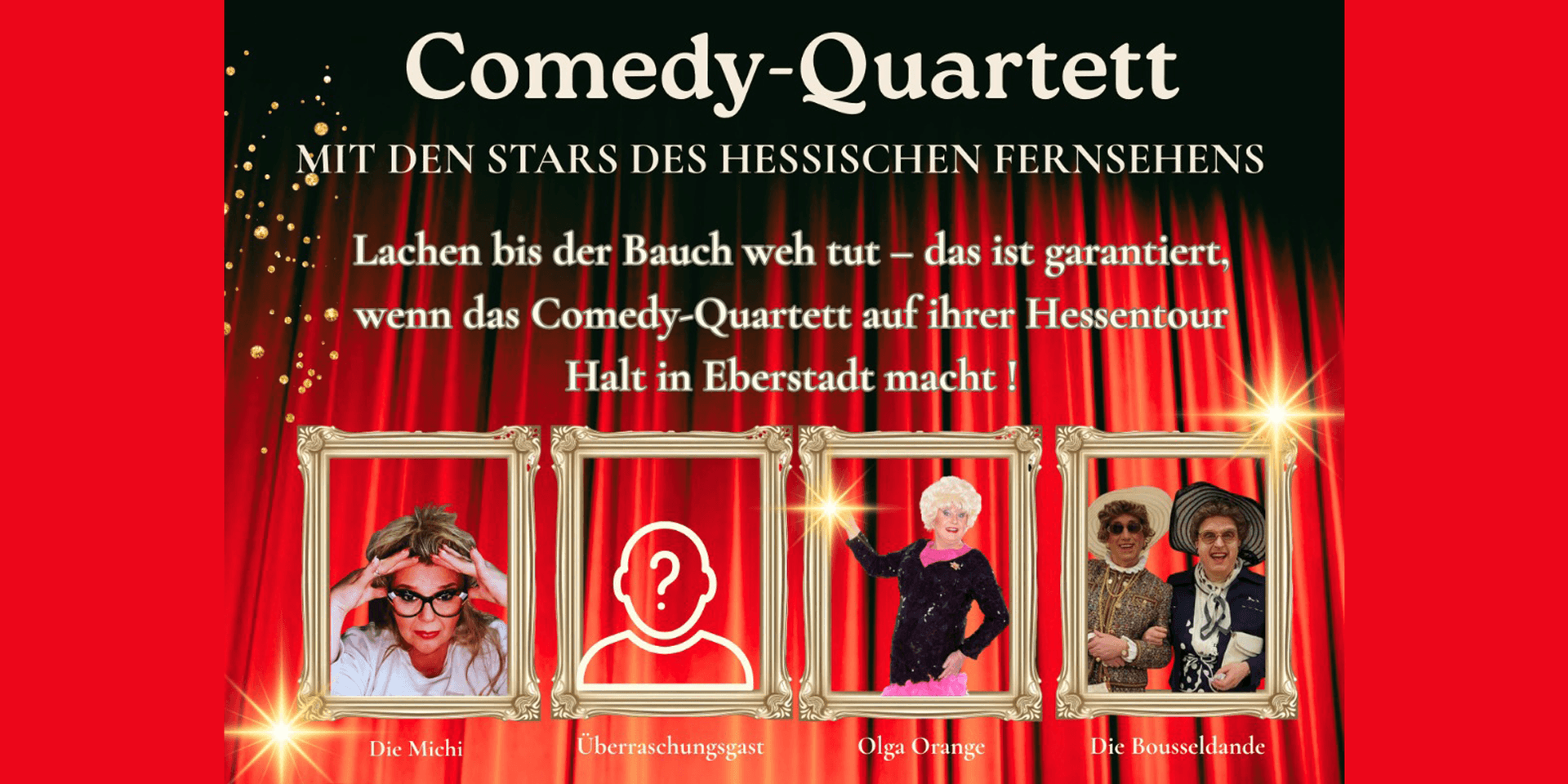 Vier Stars aus dem hessischen Fernsehen bringen Witz, Charme und beste Unterhaltung auf die Bühne. Mit dabei: Michaela Hartnagel-Keil, die legendäre Sitzungspräsidentin der HR-Damensitzung, die unvergleichliche Olga Orange sowie Die Bousseldande. Freuen Sie sich auf pointierten Humor, starke Charaktere und jede Menge hessisches Lebensgefühl – ein Comedy-Abend zum Lachen und Abschalten!
