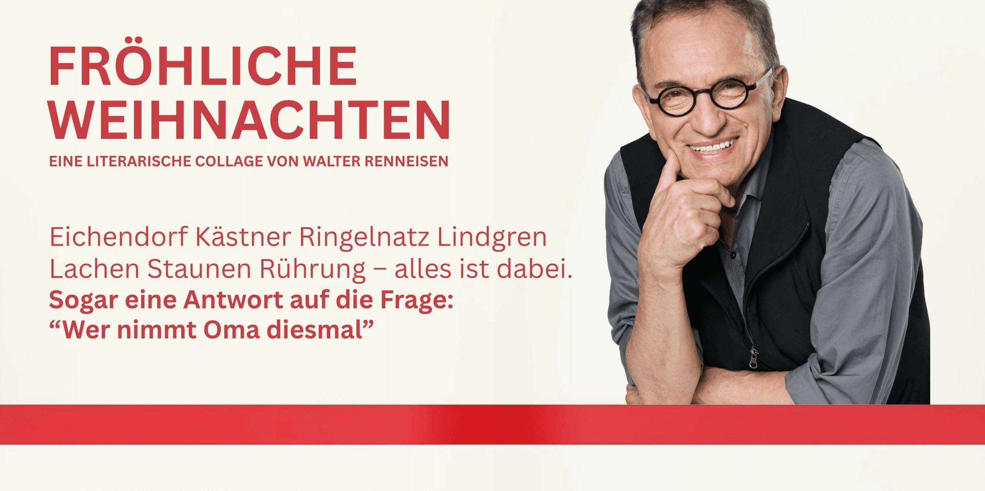 Grimme-Preisträger Walter Renneisen präsentiert Geschichten und Szenen von Erich Kästner, Astrid Lindgren, Ringelnatz u. a. – gemischt mit den ganz realen Weihnachtsproblemen: Verpackungsmüll, tropfende Kerzen, nach Dienstanweisung aufgestellte Weihnachtsbäume und am Ende die Frage, die jedes Jahr wiederkehrt: