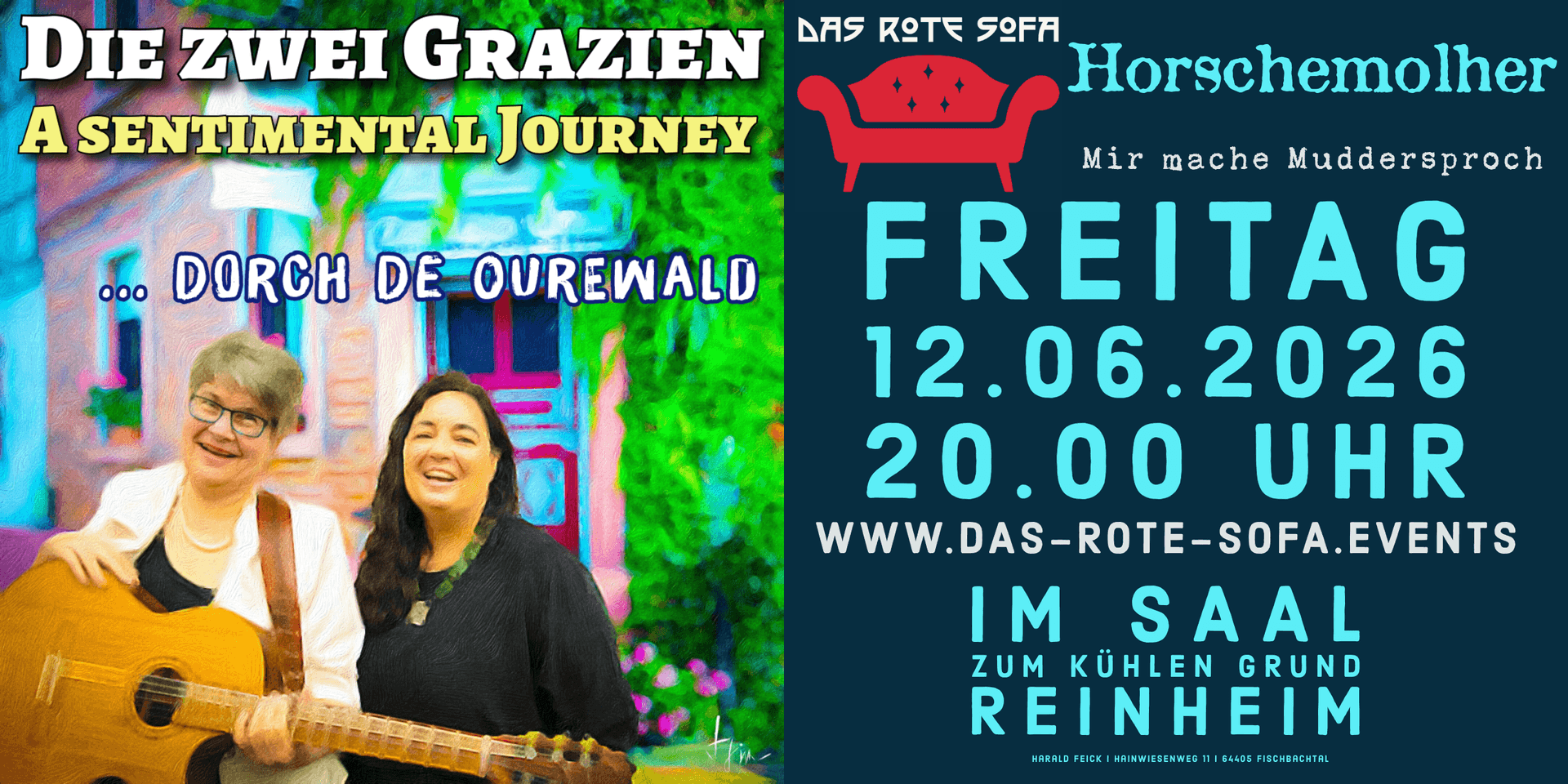 Wenn zwei Odenwälder Göttinnen zur musikalischen Reise bitten, dann darf man sich auf einen Abend freuen, der zwischen Augenzwinkern, Tiefgang und jeder Menge Charme pendelt! Mit Gitarre im Koffer, Percussion im Handgepäck und zwei unverwechselbaren Stimmen entführen Sybille Fändrich und Ulrike Scherb ihr Publikum auf eine „Sentimental Journey“ – von Jazz über Blues bis Pop, gewürzt mit feinem Humor und odenwälder Lebensweisheit.