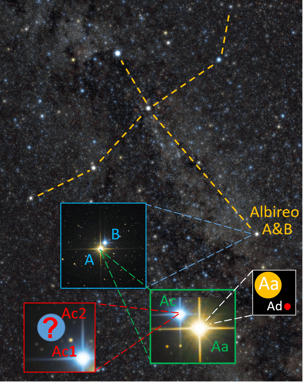 Bei dem prachtvollen Doppelstern Albireo im Sternbild Schwan scheint es eine große unsichtbare Masse zu geben. Lauert da ein Schwarzes Loch (von zwei bis drei Sonnenmassen) direkt vor unserer kosmischen Haustür? Die internationalen Astro-Detektive sind den Verdächtigen bereits auf den Fersen.