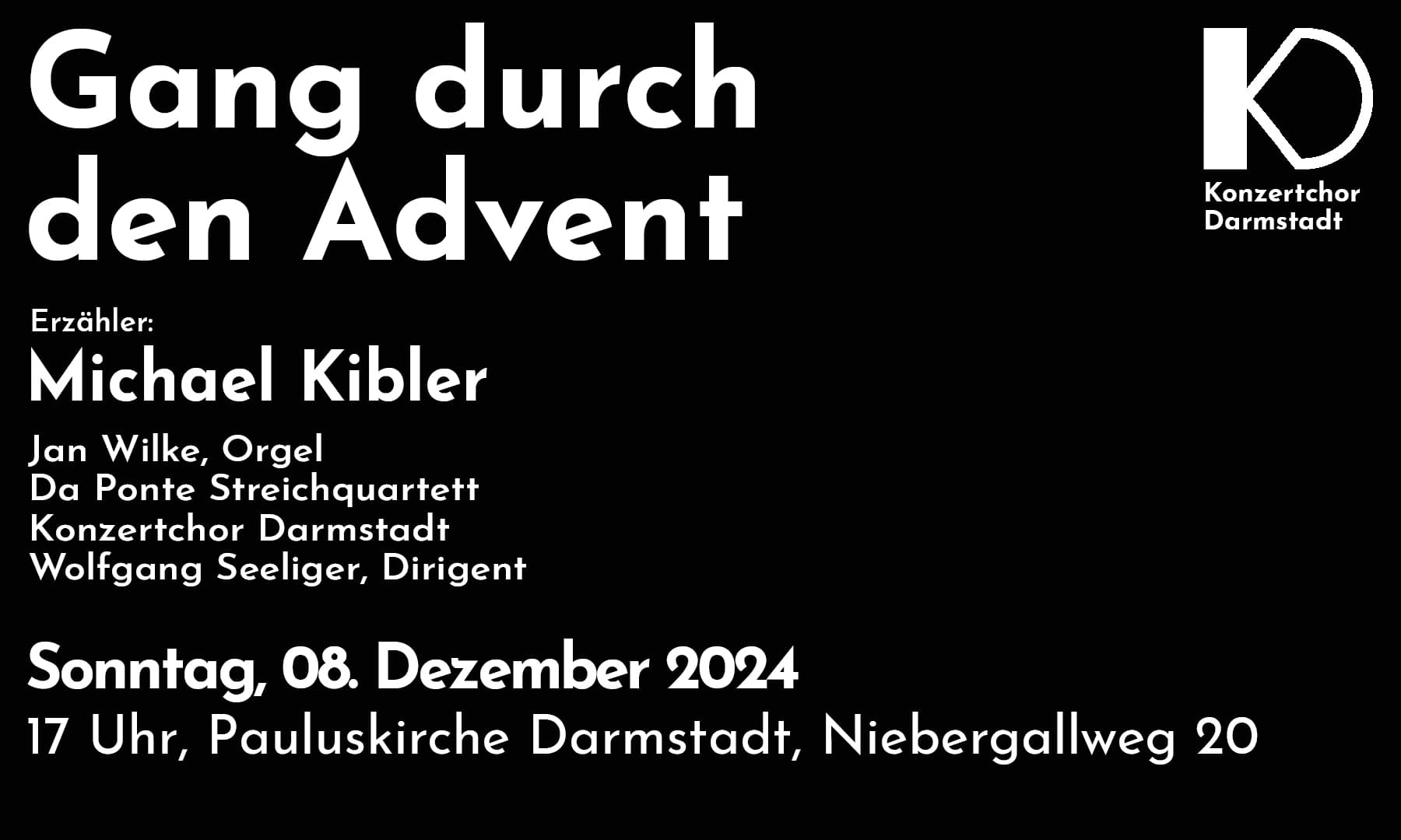 Der Konzertchor Darmstadt veranstaltet seinen „Gang durch den Advent“ dieses Jahr am 2. Adventswochenende und singt sowohl A Cappella als auch begleitet von einem Instrumentalensemble und Orgel.
