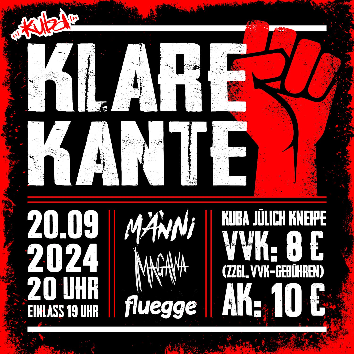 Am Freitag, 20. September 2024 heißt es ab 20 Uhr „Klare Kante!“ im Jülicher Kulturbahnhof, wenn die 3 Bands Männi, Magawa und Fluegge die Bühne in der KuBa Kneipe rocken.