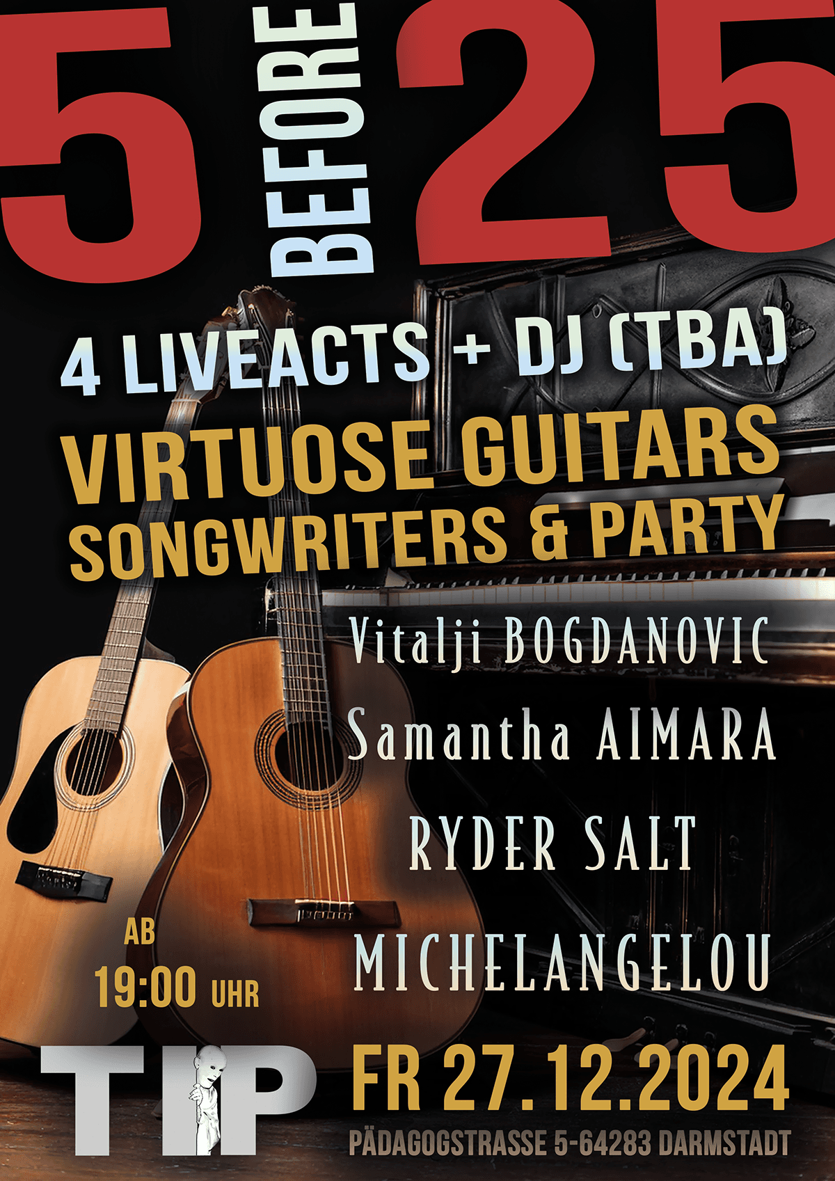 5 BEFOR 25 - 5 Acts bevor wir in das Jahr 2025 voranschreiten solltet ihr nicht verpassen! Erlebt mit uns aufregende Live-Performances von talentierten Künstlern, die euch mit ihren einzigartigen Stilen und Klängen begeistern werden.Im Anschluss sorgt unser DJ für die besten Beats und bringt die Tanzfläche zum Beben! Vitalji BOGDANOVIC ( Gitarre & Gesang)begeistert mit seinem virtuosen Gitarrenspiel und seinen gefühlvoll gesungenen Texten in russischer Sprache die Zuhörer. Einst spielte er schon mit seiner Country-Band in Stadien - heute ist er hier in Darmstadt Live für euch am Start! Samantha AIMARA (Piano, Gitarre & Gesang)eine peruanisch-italienisch- deutsche Mischung schreibt Songs in verschiedenen Sprachen und zieht mit ihrer einzigartigen Soul-Stimme immer wieder die Zuhörer in ihren Bann! RYDER SALT (Gitarre & Gesang)nimmt euch mit auf einen Ritt raus aus der Stadt, über traurig-schöne Berglandschaften, klaren Seen bis zum Feuer, an welchem seine unverkennbare Stimme sich mit Western- und Blues-Klängen mischt.Lieder von verblassender Liebe, Lieder über die Komplexität und den Umgang mit den eigenen Wurzeln, Lieder über den vertrauten und süßen Schmerz der Innen- und Außenwelt.Und plötzlich beginnt der öde Asphalt zu flimmern und sich in die weite, wunderbare Prärie zu verwandeln. MICHELANGELOU (Western & Spanische Gitarren, Bass & Purcussion)spielen eine einzigartige Symbiose aus spanischem Flamenco gewürzt mit einer guten Brise Classic Rock und einem Hauch Pop. Man muss es einfach Hören und Erleben! Auch an die feierwütigen Nachteulen unter euch haben wir gedacht. Ein DJ (tba) wird das letzte Quäntchen Energie aus euren Beinen raus holen, im Zweifelsfall bis ihr irgendwann kapitulierend zusammen brecht!Lasst uns das Jahr gemeinsam würdig feiern, bevor es vorbei ist!