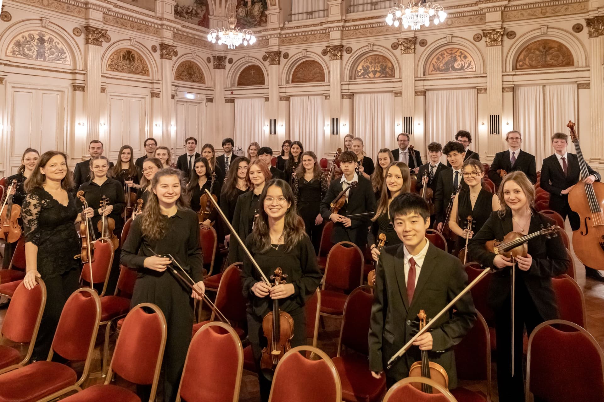 Preisträger:innen von „Jugend musiziert" in einem Orchester vereint