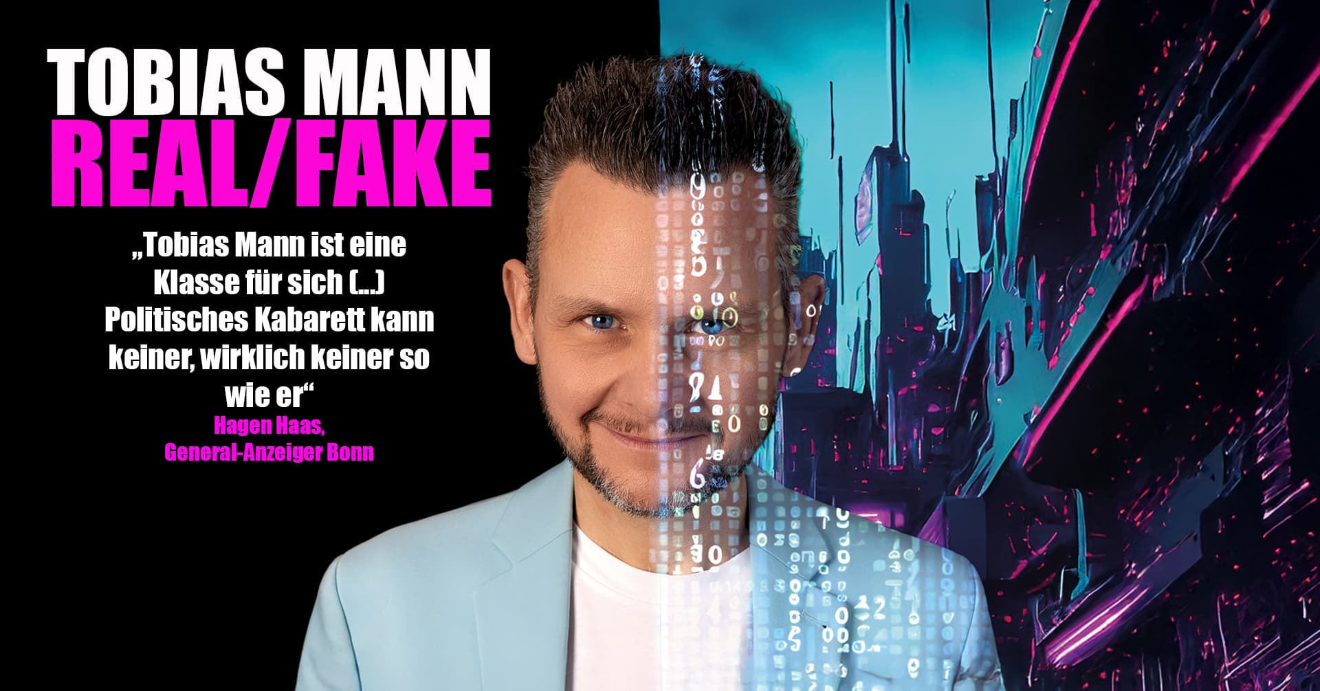 In seinem 8. Bühnenprogramm stellt sich Tobias Mann der wichtigsten Frage der Zeit: Was ist echt und was ist falsch – und spielt das überhaupt noch eine Rolle, wenn man mit einem Klick viel schönere Wahrheiten erzeugen kann, als die Realität sie hergibt? Sind Emotionen real, wenn sie vom Social-Media-Algorithmus erzeugt wurden? Und was heißt schon REAL, wenn man sich bei der alltäglichen Selbstbeobachtung zwischen seinem Spiegelbild und dem bearbeiteten Profilfoto im Netz entscheiden muss? “Fake it til you make it!” ist das Motto der Zeit. REAL war gestern, dem FAKE gehört die Zukunft. Darum hat Tobias Mann trotz aller Widrigkeiten der Gegenwart extrem gute Laune und ist sicher: „Alles wird gut!“ Schließlich werden selbst die größten Probleme dieses Planeten künftig vom Computer gelöst. Gut, hoffentlich merkt der Rechner nicht, dass der Mensch das Problem ist. „Tobias Manns Programm ist zweifellos die beste Show, die man sich ansehen kann, da es mit unübertroffener Brillanz, intelligentem Witz und einer unwiderstehlichen Bühnenpräsenz das Publikum in seinen Bann zieht und unvergessliche Momente schafft.“ Diesen Satz hat sich kein übereifriges Management ausgedacht, sondern die Künstliche Intelligenz. Ist die Information damit nun FAKE oder REAL? Um das herauszufinden, muss man sich den preisgekrönten Kabarettisten und Musiker (Das ist übrigens REAL – Deutscher Kleinkunstpreis, Bayerischer Kabarettpreis, Prix Pantheon uvm.) allerdings selbst anschauen. In Texten und Liedern widmet sich der Mann mit sonnigem Gemüt und unerschütterlichem Humor falschen Wahrheiten und wahren Fakes. Ein Abend mit tiefschürfenden Gedanken, cleverer Satire und puppenlustigem Blödsinn vom FachMann - das sollte man sich nicht entgehen lassen. Echt jetzt!